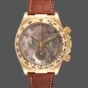 Rolex Daytona 116518 MOP Diamond Dial Yellow Gold 40mm Mens Replica Watch.40mm Yellow gold Case. Fixed Tachymeter Engraved Bezel. Scratch resistant sapphire crystal. Mother of pearl dial with diamond hour markers. Small seconds hand at 6 o’clock. Centre chronograph hand, 30-minute counter at 3 o’clock and 12-hour counter at 9 o’clock. Brown leather strap with yellow gold deployent buckle.which looks pretty stunning and high-end.
