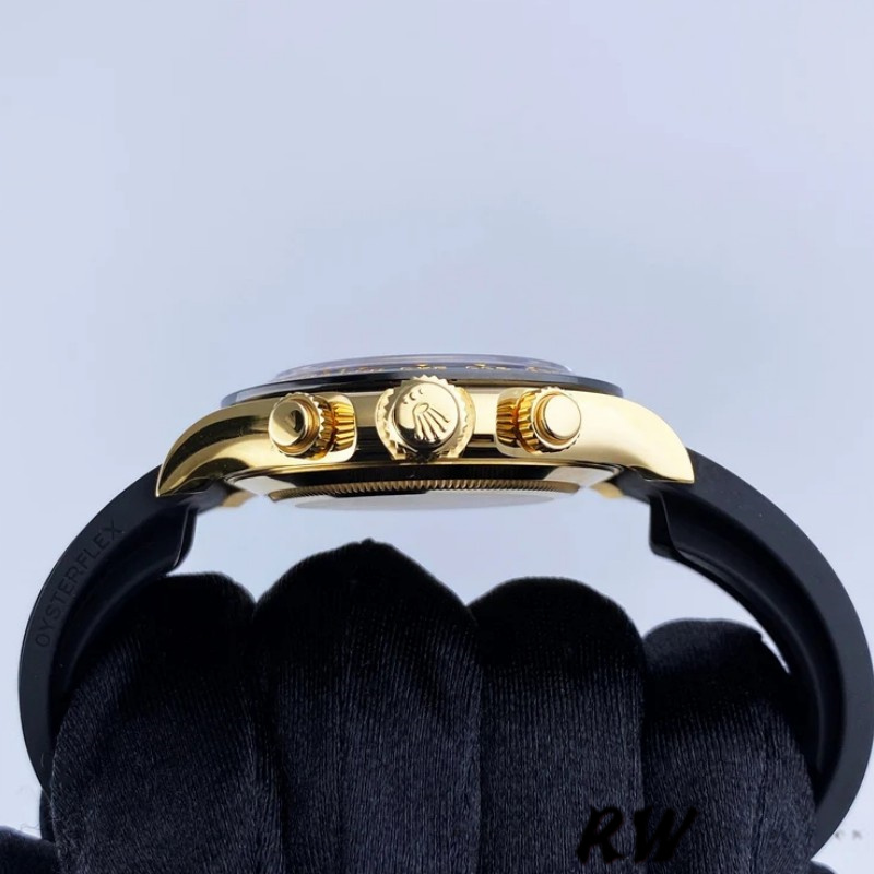 Rolex Daytona 116518LN Yellow Gold Champagne Dial 40mm Mens Replica Watch.40mm yellow gold case with ceramic black bezel. Champagne dial with luminous gold hands and index hour marker. Three black sub-dials. Small seconds hand at 6 o’clock. 30-minute counter at 3 o’clock. 12-hour counter at 9 o’clock. Minute maker on the outer dial. Black rubber Oysterflex strap with fold over clasp with safety. Will fit up to 6.5-Inch wrist.