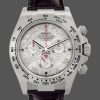 Rolex Daytona 116519 Blue Leather strap Meteorite Dial 40mm Mens Replica Watch.The 40mm diameter solid three-body case, integral lugs, and angled bezel are polished/brushed.Meteorite dial with black hands and Roman numeral hour marker. 30 minute recorder at 3 0’clock, small seconds at 6 0’clock, 12 hour recorder at 9 0’clock, a fixed white gold polished tachymetre bezel, brown leather strap with an brushed and polished white gold oysterlock deployant clasp, sapphire glass.