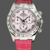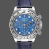 Rolex Daytona 116519 Sodalite Arabic Dial Blue Alligator Leather 40mm Mens Replica Watch. 40.00mm case size in white gold, sodalite arabic dial on a blue alligator leather bracelet.Featuring a Sodalites blue dial with three sub-dials, fixed engraved tachymeter in a white gold bezel, numeral applied white gold markers, the watch is fitted with a blue alligator leather strap and white gold deployment clasp.