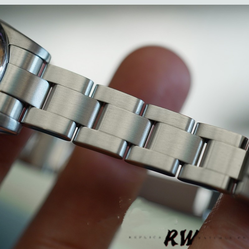 Rolex Oyster Perpetual 176200 Stainless Steel Blue Index Dial 26MM Lady Replica Watch features a 26mm stainless steel case,Stainless steel smooth domed bezel. Scratch resistant sapphire crystal. Black dial with arabic numerals and Blue luminous baton hour markers. Stainless steel oyster bracelet with a fold over clasp.