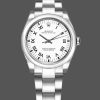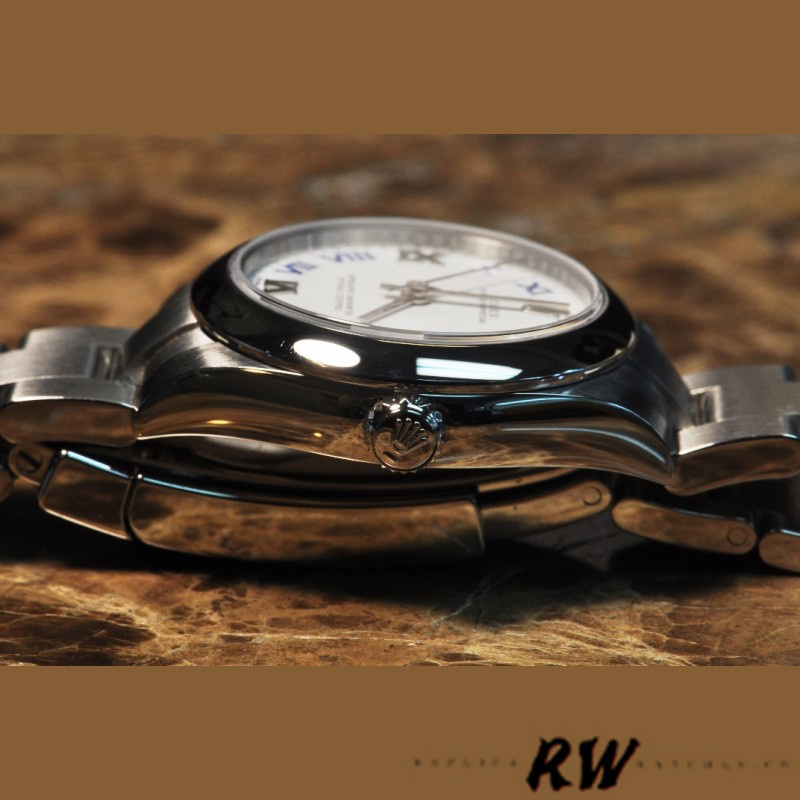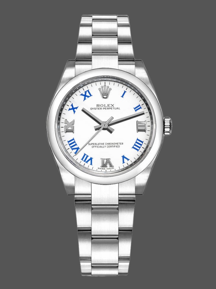 Rolex Oyster Perpetual 177200 White Dial Blue Roman Oyster Bracelet 31mm Lady Replica Watch,31mm Stainless steel oyster case in diameter. Stainless steel smooth domed bezel. Scratch resistant sapphire crystal. White dial with painted blue Roman numerals and applied white gold Roman numerals at III, VI, and IX. Stainless steel oyster bracelet with a fold over clasp.