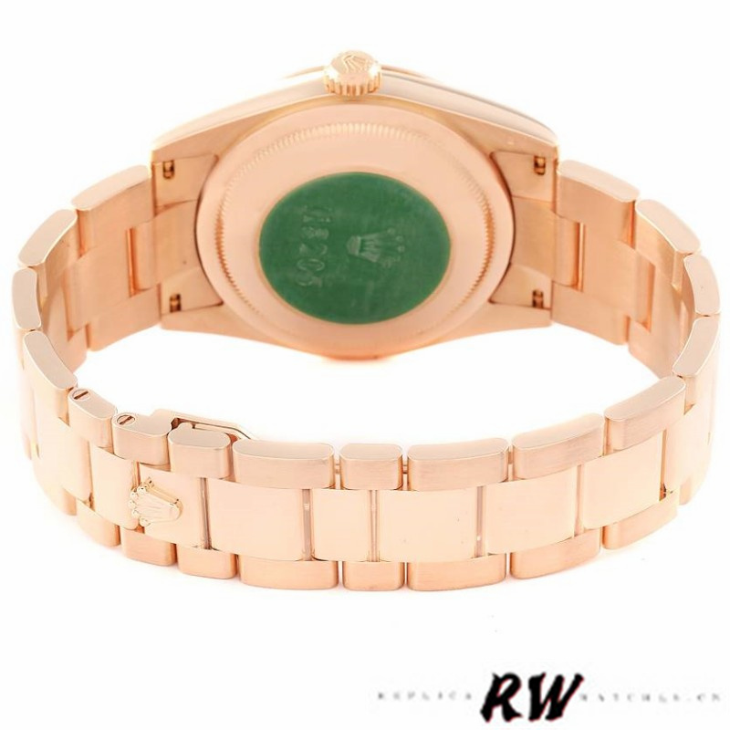 Rolex President Day Date 118205 Rose Gold Black Dial 36mm Mens Replica Watch.Rose gold oyster case 36.0 mm in diameter.Rose gold smooth domed bezel. Scratch resistant sapphire crystal with Cyclops magnifier. Black dial with raised rose gold Arabic numeral hour markers. Date calendar at 3 o’clock aperture. Day window at 12.Rose gold oyster bracelet with hidden clasp. Fits 7 1/4″ wrist.
