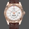 Rolex Sky-Dweller 326135 Sundust Dial Rose Gold 42MM Mens Replica Watch,42mm Everose gold case, bidirectional rotatable ring command fluted bezel , Sundust Dial with Roman Numeral Hour Markers.Second time-zone displayed via off-center rotating disc, Saros annual calendar with date at 3 o’clock and month indicated in discrete apertures at each of the 12 hour marks, Alligator leather strap with Everose gold folding Oysterclasp.