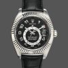 Rolex Sky-Dweller 326138 White Dial Yellow Gold 42MM Mens Replica Watch,42mm yellow gold case, bidirectional rotatable ring command fluted bezel , White dial with yellow gold hands and index hour markers.Second time-zone displayed via off-center rotating disc, Saros annual calendar with date at 3 o’clock and month indicated in discrete apertures at each of the 12 hour marks, Alligator leather strap with Yellow gold folding Oysterclasp.