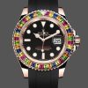 Rolex Yacht-Master 116695 Black Rubber Strap Blue Dial 40MM Mens Replica Watch,40mm Everose Gold Case and Diamond Bezel,Blue dial has luminescent hands and dot hour markers.A date window displayed under a cyclops lens at 3 o’clock ,The case back is screwed in.Black Rubber Strap,Folding safety buckle with rapid extension system.