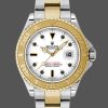 Rolex Yacht-Master 168628 MOP Dial 35mm Unisex Replica Watch.The watch has a round yellow gold case with a matching bezel. A mother of pearl dial with the black triangular, dot and baton hour markers. A date window, and gold luminous hands. Date calendar at 3 o’clock aperture.The watch is secured by signature Oyster Perpetual bracelet,folding clasp.Fits 7″ wrist.