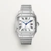 Santos watch, medium model, mechanical movement with automatic winding, calibre 1847 MC. 18K yellow gold case, 18K yellow gold 7-sided crown set with a faceted sapphire, silvered opaline dial, blued-steel sword-shaped hands, sapphire crystal. 18K yellow gold bracelet with “SmartLink” adjustment system. Second bracelet in alligator skin, with interchangeable 18K yellow gold folding buckle. Both bracelets are fitted with the “QuickSwitch” interchangeability system. Case width: 35.1 mm, thickness: 8.83 mm. Water-resistant to 10 bar (approx. 100 metres).