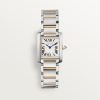 Tank Louis watch, large model, Manufacture mechanical movement with manual winding. Case and beaded crown in rose gold 750/1000 set with 41 brilliant-cut diamonds totalling 0.66 carats. Silver-grained dial, blued-steel sword-shaped hands, mineral crystal, claret alligator-skin strap, ardillon buckle in rose gold 750/1000. Case dimensions: 33.7 mm x 25.5 mm. Thickness: 6.6 mm. Water-resistant to 3 bar (approx. 30 metres).