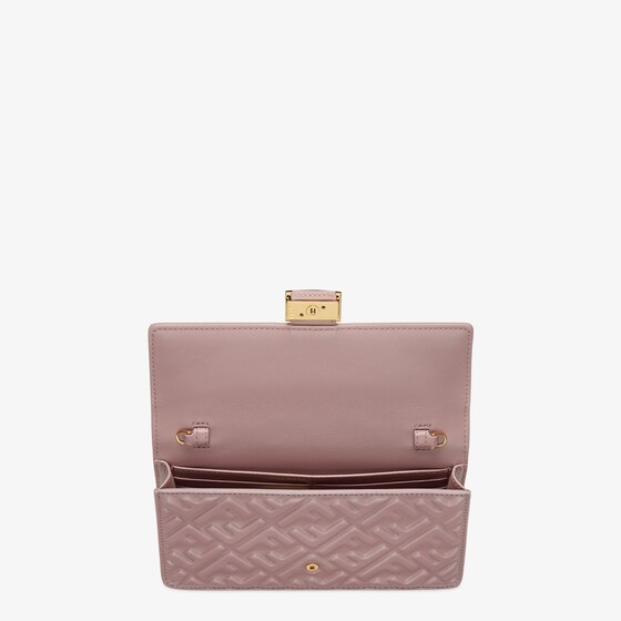 Compact Baguette wallet with flap and FF clasp. Interior compartment with six card slots. Double shoulder strap, an adjustable leather option and a detachable thin chain option:to carry the bag like a clutch, under the arm or wear it cross-body. Made of mauve pink nappa leather with an embossed FF motif. Gold-finish metalware.