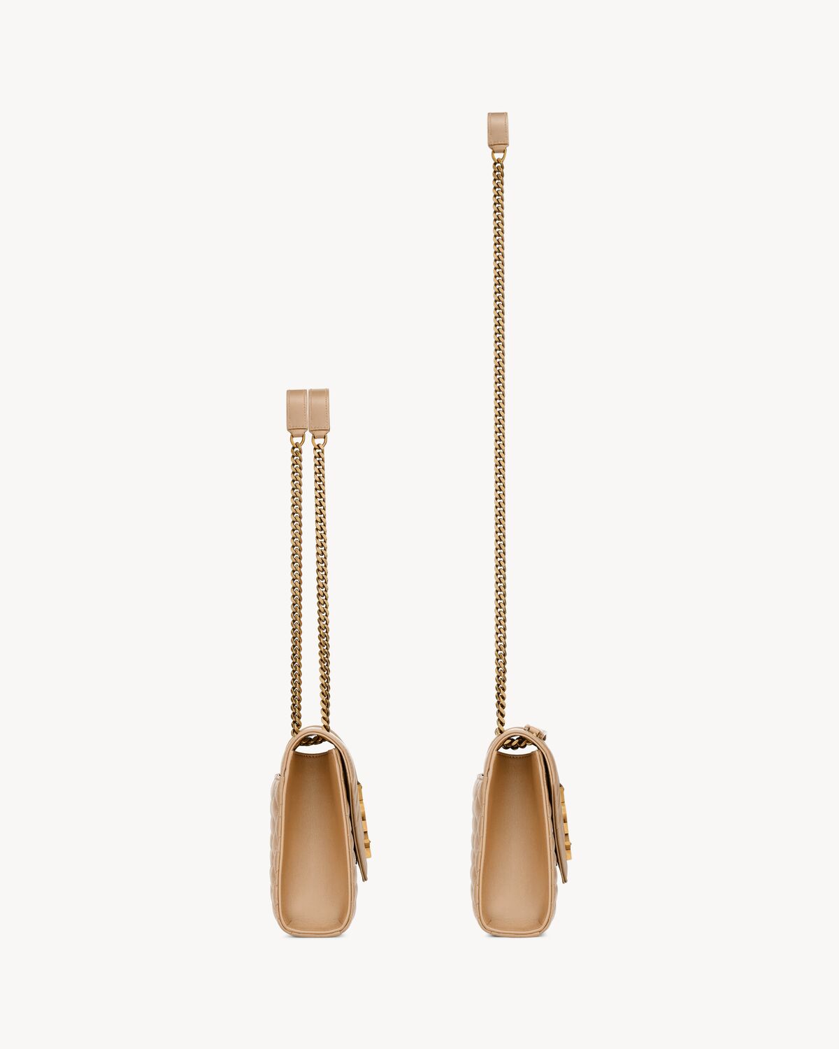 This versatile piece features a sliding leather-and-chain strap that can be worn two ways.